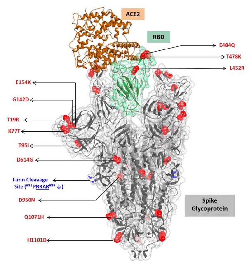| さて、本題のインド株の変異についてです。 変異株なんてどうでもいいやと思っていましたが、TV等でやたら変異株について、 感染力が今までの従来株の1.95倍の感染力があると、京都大学の西浦教授が言ったとのことで、相当感染力が強いのだろうと思っていました。 昨日、論文を探してみるかと探してみました。Natureのも1通ありましたが、あまり面白そうな内容ではないので、プレプリント版の論文を見ていました。 本文はあまり大したことが書いてないので読む必要はなさそうでしたが、面白いことに気が付きました。 このインド株もfurin cleavage部位が変異しているのです。 塩基の変化は不明ですが、イギリス株と同じ681番のアミノ酸がP=プロリンからR=アルギニンに変異しているのです。 このアルギニンがもしCGGだとしたらCGGが3個並ぶことになります。これまた自然界では起こりにくい現象だと思われます。 さらに不思議なのが、29000個以上ある塩基の中で、イギリス株とインド株が同じスパイク蛋白の681番目のアミノ酸が変異したということです。 偶然としても不自然な一致だと思いました。 下図は昨日見つけた変異株の論文からのシェーマです。 ![]() これを見ると、インド株はヨーロッパで当初流行ったD614Gの変異がベースにあるのが解ります。 furin cleavageの変化を考えると、パンデミックが起こって以来、世界中を悩ませている変異株がヒトの手によるものではないかという妄想が湧いてきます。 今後も同じことが繰り返される印象です。 上記の論文は次の通りです。Convergent evolution of SARS-CoV-2 spike mutations, L452R, E484Q and P681R, in the second wave of COVID-19 in Maharashtra, India |
